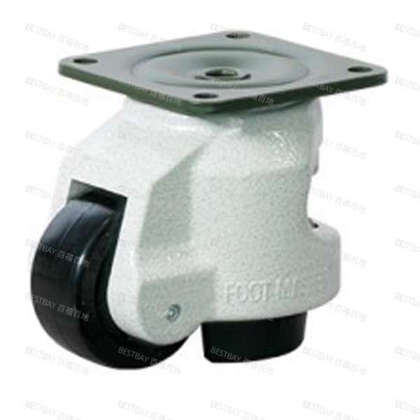 冲压脚轮座,使用强化热处理的双重钢珠槽旋转结构,象牙白铝制壳体,通过一体型棘轮手把调节高度,NBR防震动底座