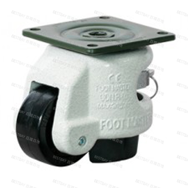 冲压脚轮座,使用强化热处理的双重钢珠槽旋转结构,象牙白铝制壳体,通过一体型棘轮手把调节高度,NBR防震动底座