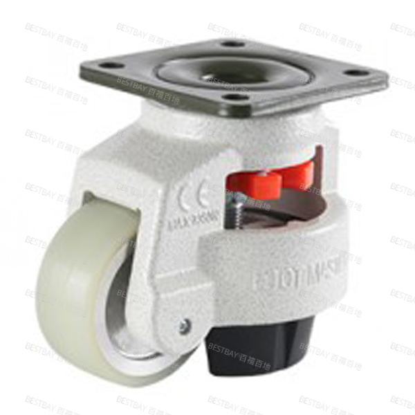 冲压脚轮座(150系列:锻造),使用强化热处理的双重钢珠槽旋转结构,象牙白铝制壳体,橙色手把或通过扳手调节高度(120/150系列:仅适用扳手调节),NBR防震动底座(120系列:ABS或AL,150系列:AL)