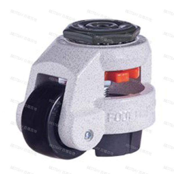 冲压脚轮座(100/120系列:锻造),使用强化热处理的双重钢珠槽旋转结构,象牙白铝制壳体,橙色手把或通过扳手调节高度(120系列:仅适用扳手调节),NBR防震动底座(120系列:ABS或AL)