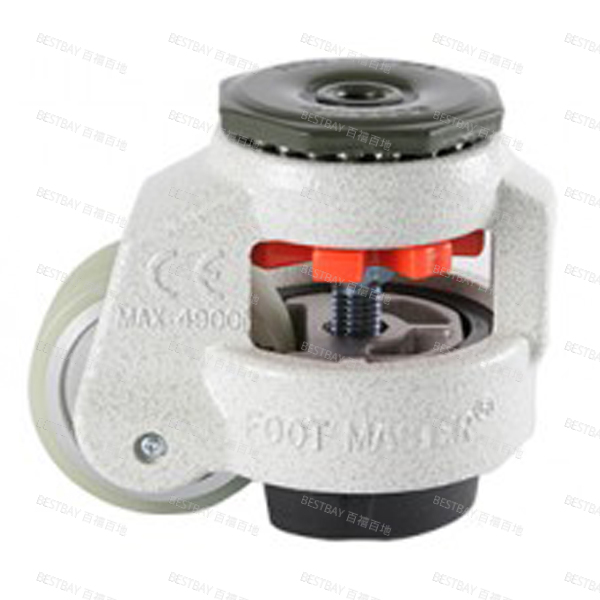 冲压脚轮座(100/120系列:锻造),使用强化热处理的双重钢珠槽旋转结构,象牙白铝制壳体,橙色手把或通过扳手调节高度(120系列:仅适用扳手调节),NBR防震动底座(120系列:ABS或AL)