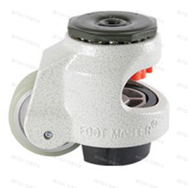 冲压脚轮座(100/120系列:锻造),使用强化热处理的双重钢珠槽旋转结构,象牙白铝制壳体,橙色手把或通过扳手调节高度(120系列:仅适用扳手调节),NBR防震动底座(120系列:ABS或AL)
