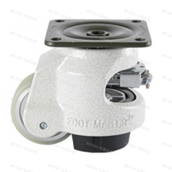 冲压脚轮座,使用强化热处理的双重钢珠槽旋转结构,象牙白铝制壳体,通过一体型棘轮手把调节高度,NBR防震动底座