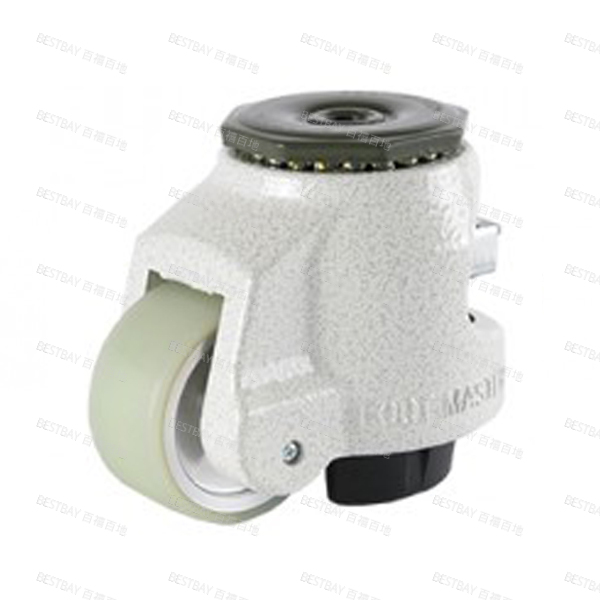 冲压脚轮座,使用强化热处理的双重钢珠槽旋转结构,象牙白铝制壳体,通过一体型棘轮手把调节高度,NBR防震动底座