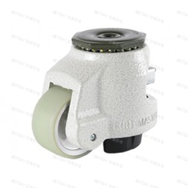 冲压脚轮座,使用强化热处理的双重钢珠槽旋转结构,象牙白铝制壳体,通过一体型棘轮手把调节高度,NBR防震动底座
